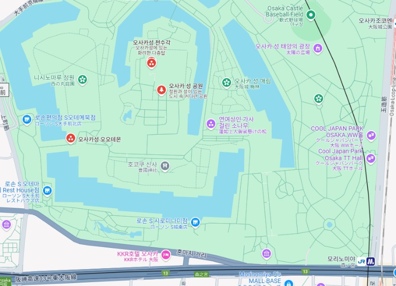 오사카성에 가장 가까운 루트는 왼쪽 오사카성 오오테몬이 택시승강장도 있고,